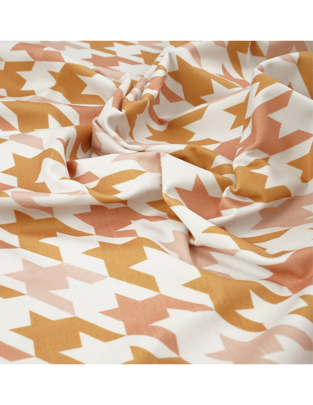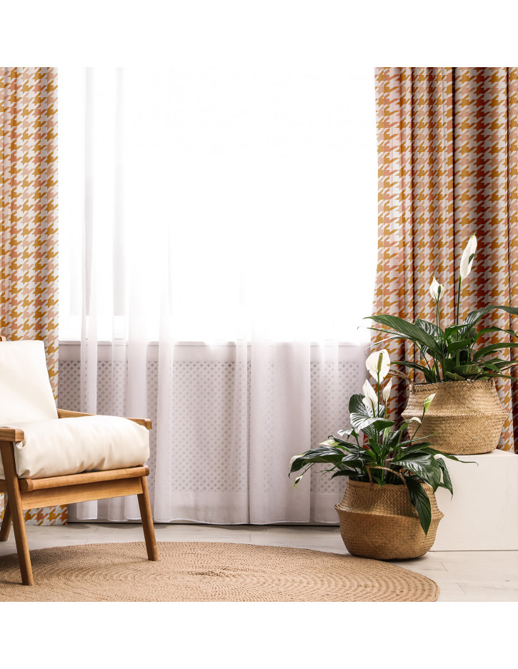 A large houndstooth material with a bold combination of yellow with pink and white, which is perfect for armchair upholstery or accessories in the form of pillows or curtains. Such a bold color combination is a great finish for your interior.