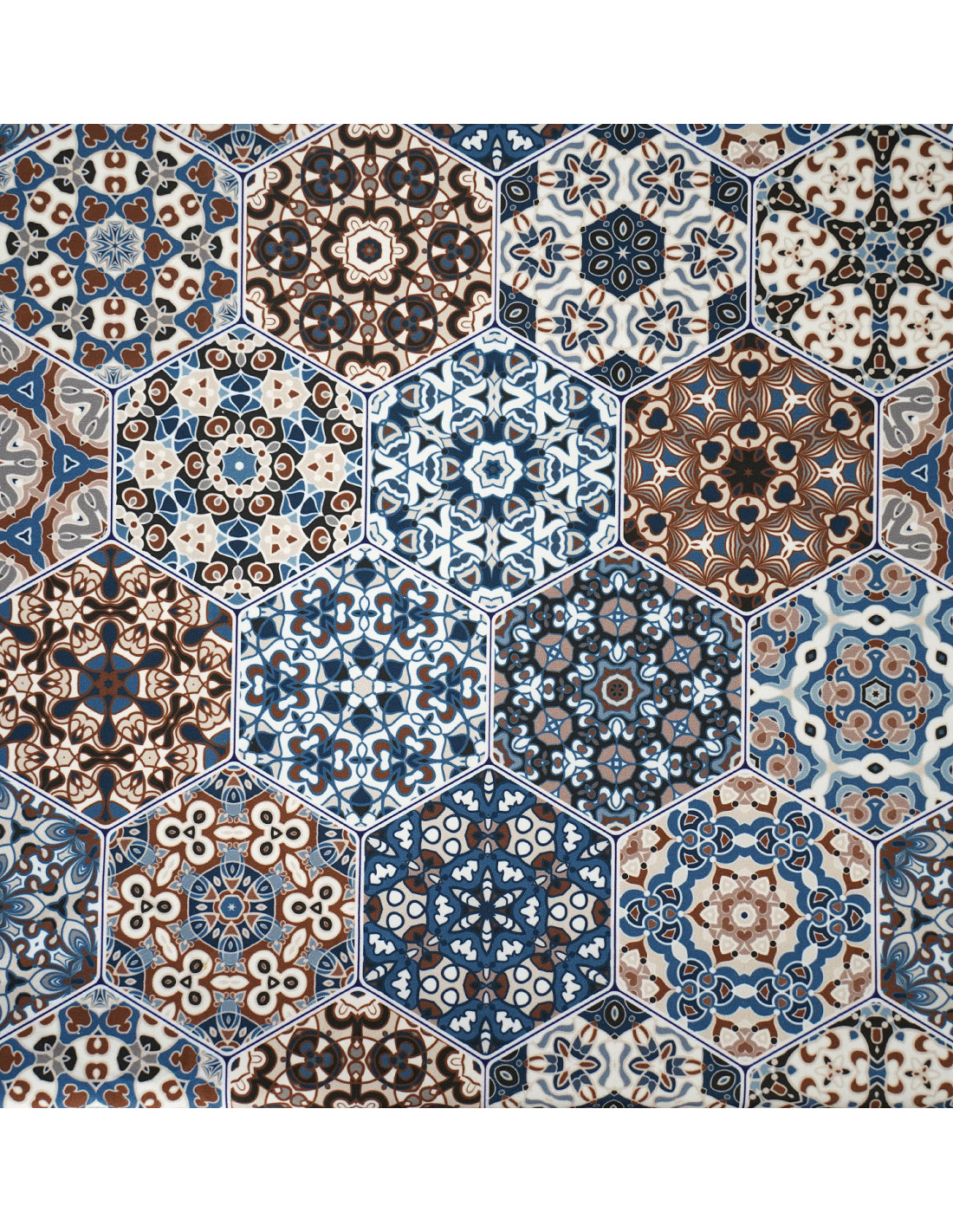 Tkanina HEXAGONY 02 SOFT VELVET ( hexagony mandala niebiesko - beżowe )
