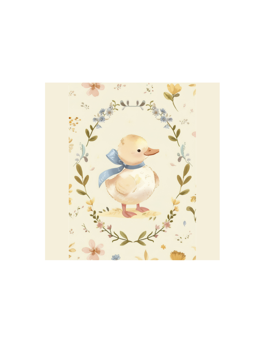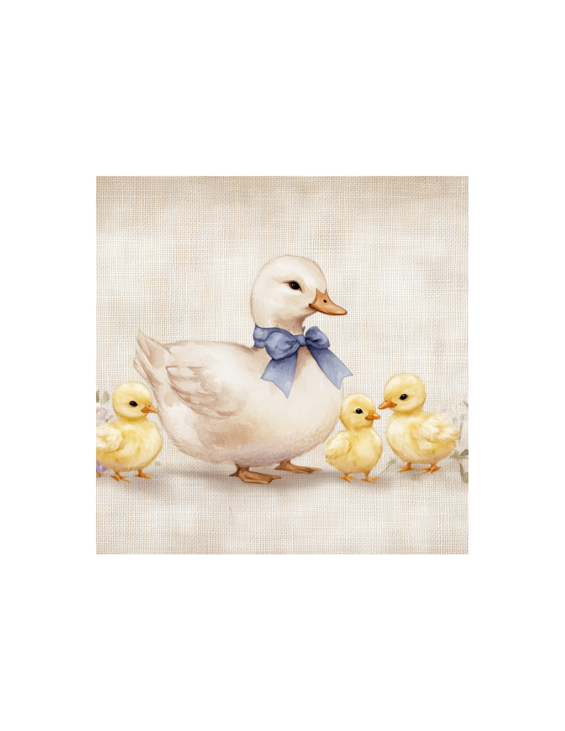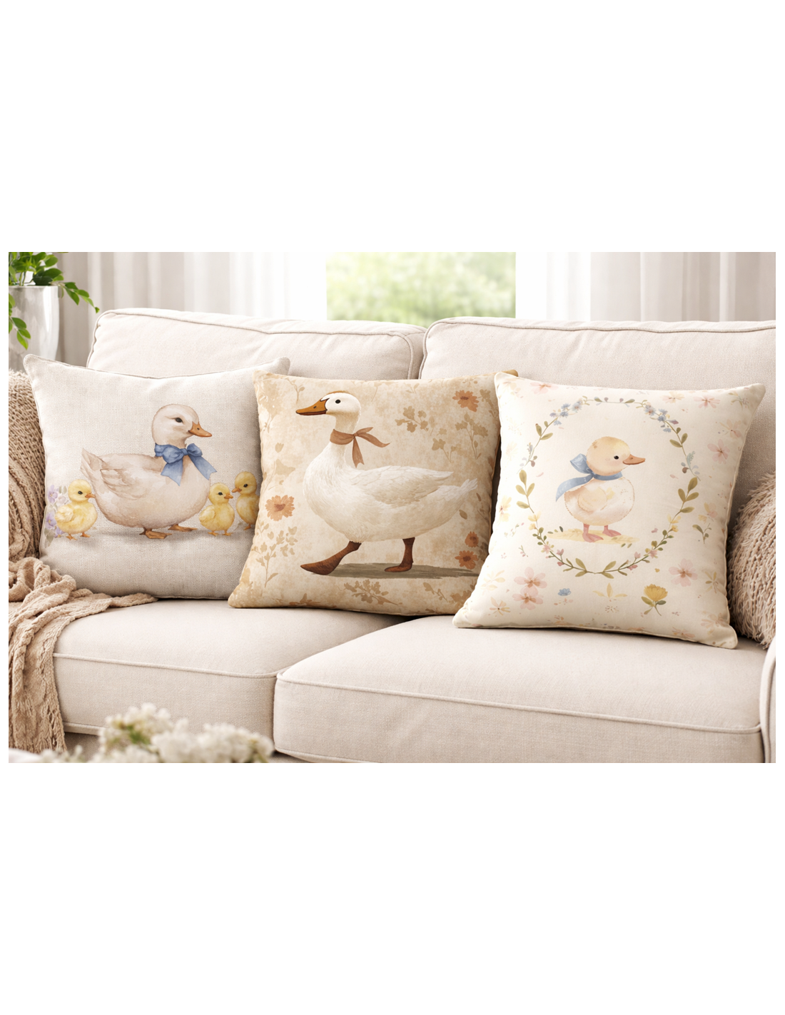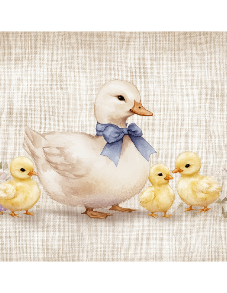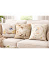 Panel poduszkowy o wymiarach ok. 50 × 50 cm z delikatną, akwarelową ilustracją w wielkanocnym stylu. Wzór przedstawia urocze kaczuszki i gąski z kokardkami, otoczone subtelnymi, pastelowymi kwiatami i wiankami, w ciepłej, naturalnej kolorystyce beżu, kremu, błękitu i pudrowej żółci. Całość utrzymana jest w stylu vintage / cottage, idealnie pasującym do wiosennych i świątecznych aranżacji wnętrz.