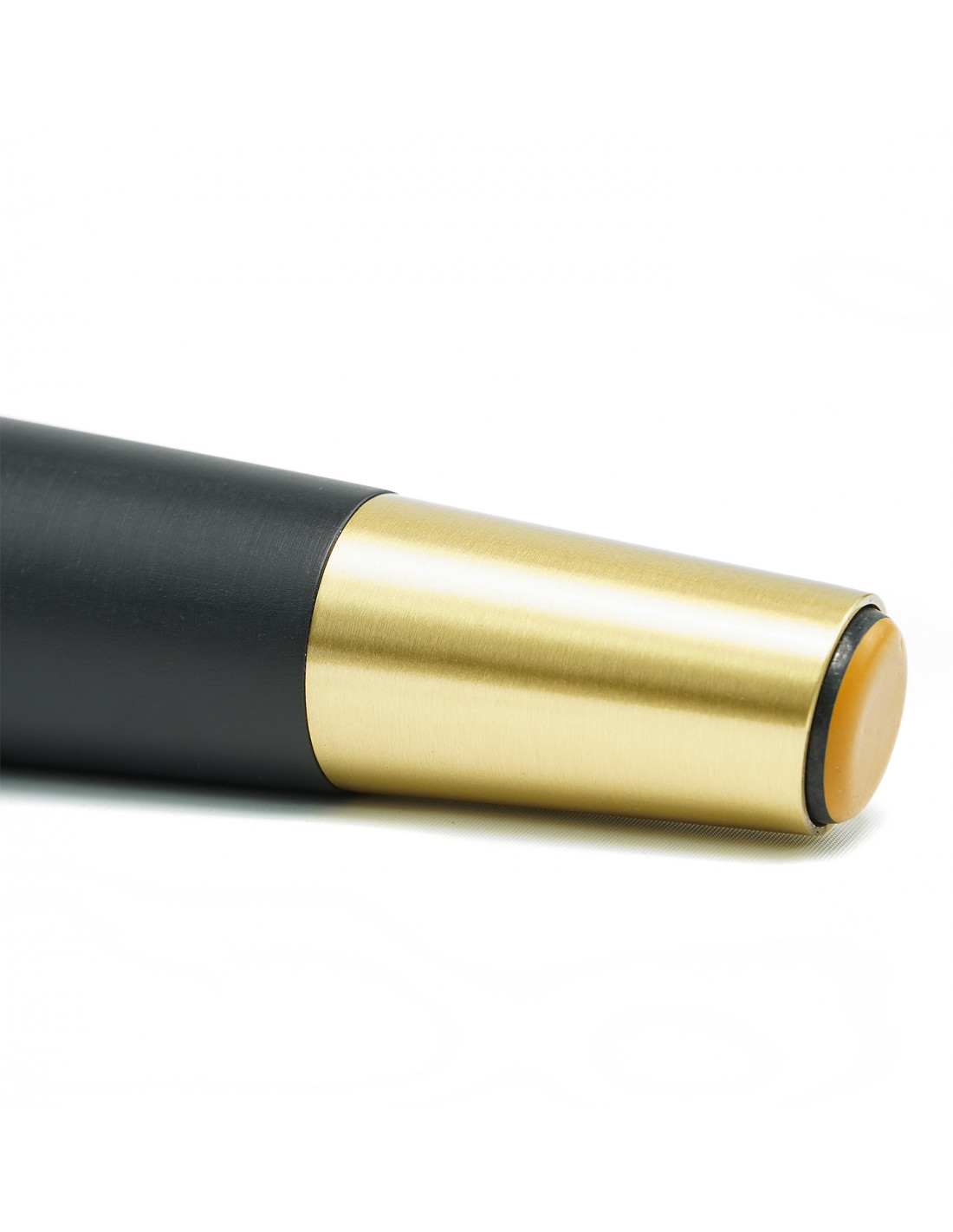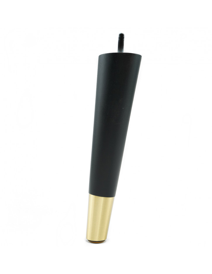 Noga meblowa drewniana skośna z nasadką mosiężną scalona za pomocą śruby. Wysokość mosiężnej nasadki to 6 cm, a całkowita wysokość nogi wynosi 18 cm, co czyni ją przystosowaną do wnętrz minimalistycznych, jak i nowoczesnych i klasycznych. Odlewana mosiężna nasadka to gwarancja wysokiej jakości - noga nie deformuje się, nie rysuje, jak również nie łuszczy. Montaż możliwy za pomocą nakrętki pazurkowej i mufy. W nodze zamontowany został trzpień gwintowany M8 na nakrętkę M8. Noga w kolorze czarny półmat pasuje zarówno do mebli tapicerowanych ( sof, kanap, foteli i puf ) i mebli twardych (szaf, komód i szafek RTV).