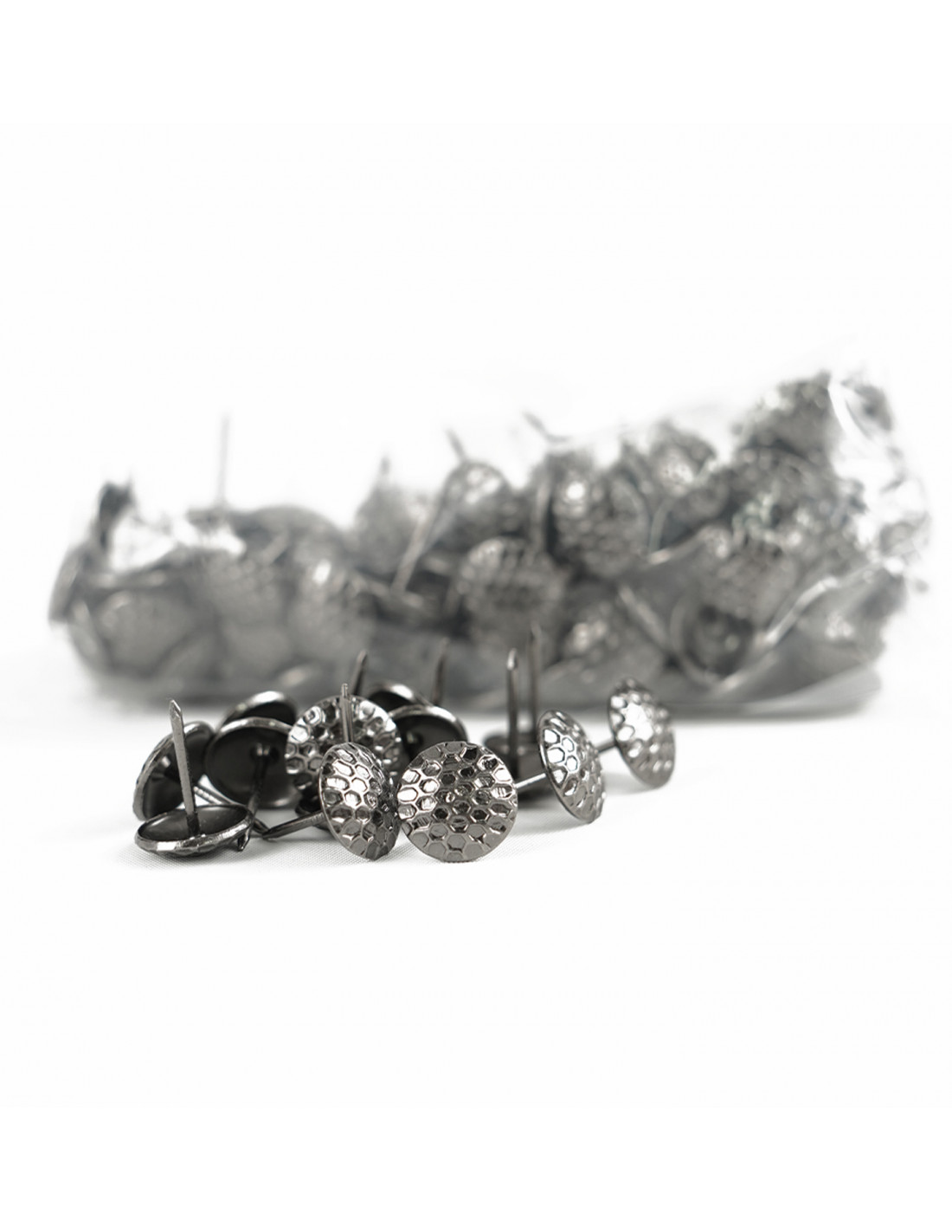 Opakowanie zbiorcze zawiera 300 sztuk pinezek dekoracyjnych stylizowanych w kształcie plastra miodu. Drobny element dekoracyjny idealny do wykończenia mebli tapicerowanych, jak również doskonały pomysł na ukrycie pewnych łączeń materiałów z konstrukcją mebla. Pinezki wykonano z wysokiej jakości materiałów - wytrzymałego metalu zdobionego na różne sposoby, co sprawia, że są dużo trwalsze i lepiej pełnią swoje funkcje. Pinezka tapicerska to element potrzebny nie tylko przy meblach tapicerowanych, sprawdzi się również jako dekoracja mebli drewnianych.